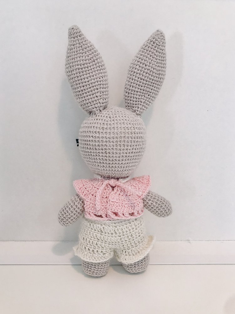 Baby Bunny Crocheted from Alpaca yarn & Merino Wool; 100% Polyester filling Cold Wash on Wool Cycle. Approximately 26cm tall. Guide Price 35 EUR Date December 24, 2023 Share facebook pinterest